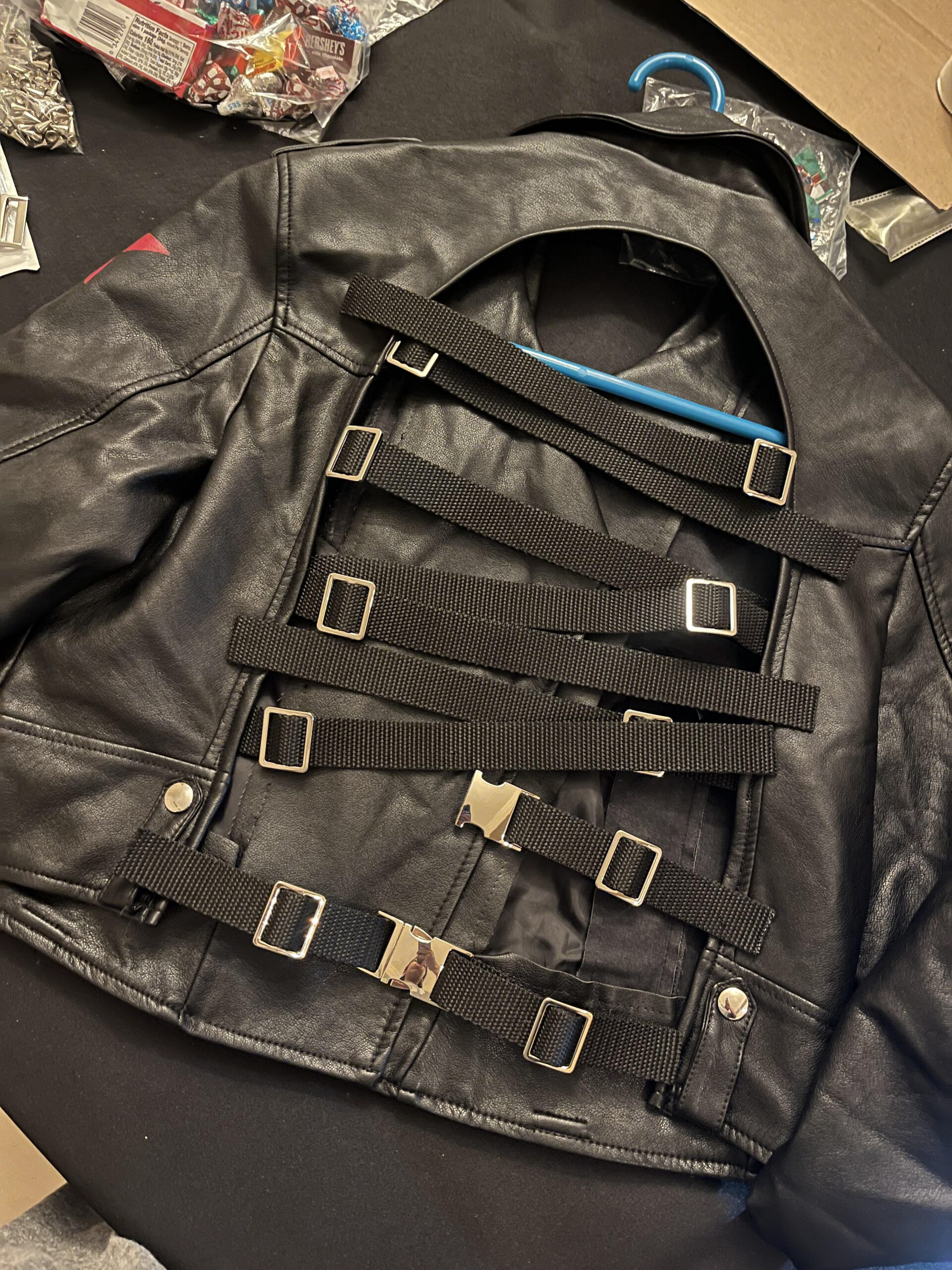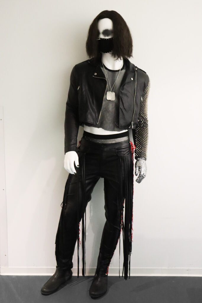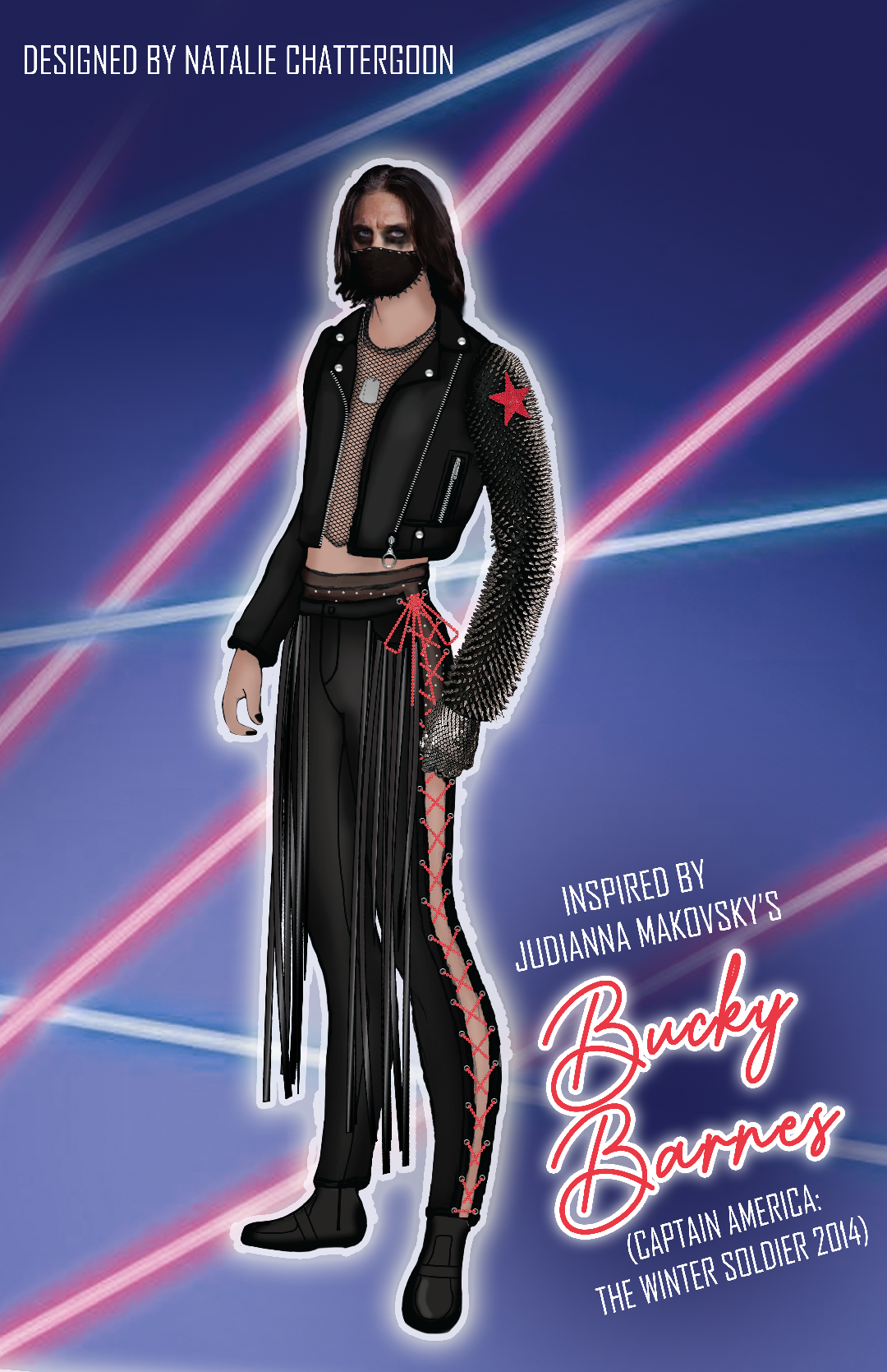 Other integral elements from Bucky’s original costume were thoughtfully incorporated into the reimagined ensemble. This includes the red star, mask, buckle detailing, eye makeup, and the utilization of leather-like fabric. The incorporation of buckle detailing not only pays homage to the utilitarian style of the original character’s garments but also serves as a way to connect the studs, grommets, and other silver detailing present throughout the ensemble, creating an overall cohesive look.