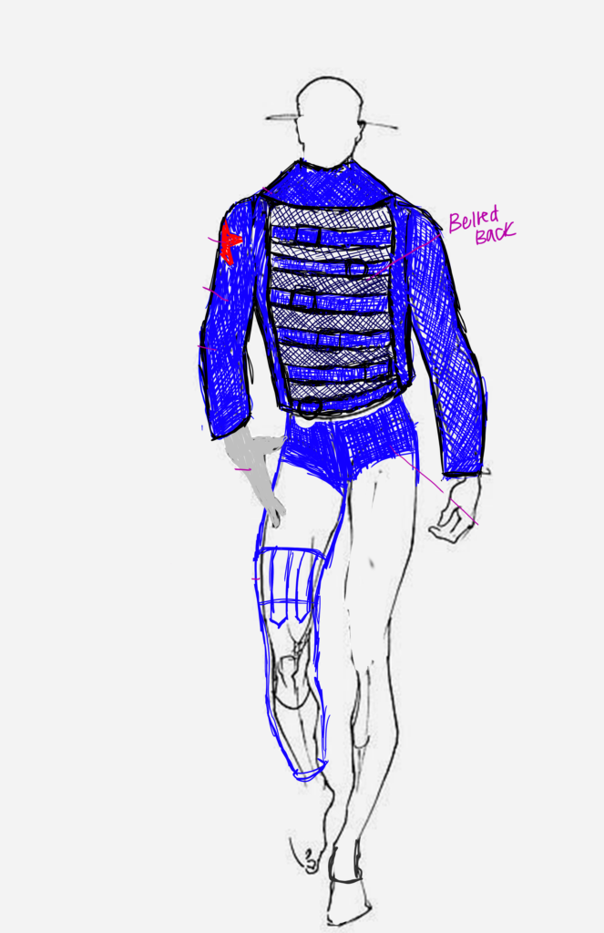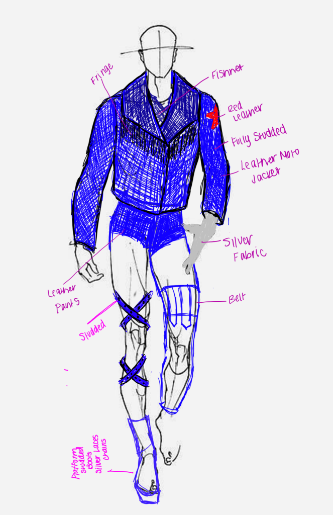 The accompanying mood board provides a visual insight into the inspiration behind my project. Showcasing images of Bucky Barnes alongside iconic figures from 80s glam rock, including Kiss, Mรถtley Crรผe, and Tom Keifer, it offers a glimpse into the integration of glam rock elements into the redesigned costume. Specifically, I will embrace a punk rock aesthetic in reimagining the costume to align with the original character’s attitude. This will involve incorporating elements such as studs, leather fabric, buckle detailing, fringe, grommets, lacing and various other punk-inspired features throughout the entire costume design.
